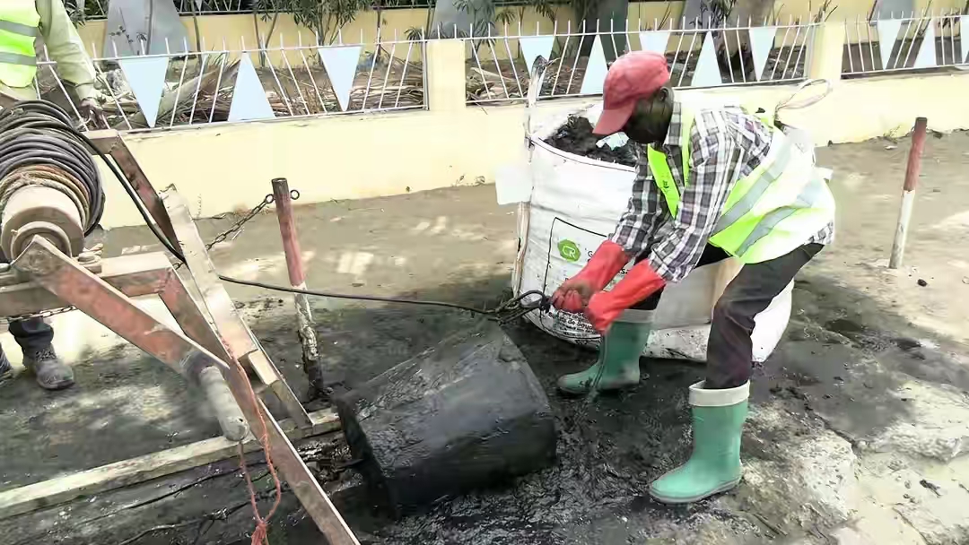 4月30日,吸污车在塞内加尔首都达喀尔市郊盖贾瓦伊区排放污水。